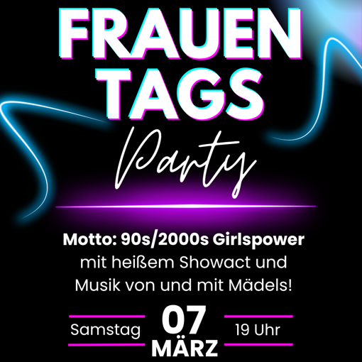 Dieses Jahr fällt der 8. März auf einen Sonntag - also feiern wir rein! Unter dem Motto "90er/2000er Girlspower" werden wir den Saal wieder zum Beben bringen.